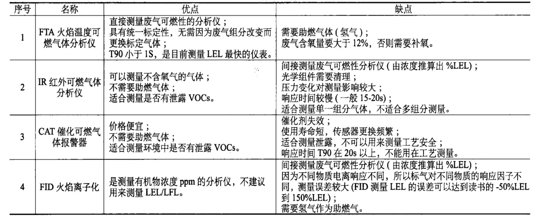 在VOCs焚燒系統(tǒng)中,如RTO、RCO、CO、TO等VOCs焚燒系統(tǒng),其中LEL檢測(cè)儀(測(cè)量VOCs的廢氣濃度的儀表)檢測(cè)的精度及反應(yīng)時(shí)間至關(guān)重要。精度太差,不能測(cè)出廢氣管道內(nèi)VOCs的實(shí)際濃度,則LEL檢測(cè)儀形同虛設(shè);反應(yīng)時(shí)間太長(zhǎng),則不能及時(shí)切斷閥門(mén),所以,在合理確定LEL檢 測(cè)儀安裝位置,確保充足的過(guò)程安全時(shí)間,防止?jié)舛瘸逇怏w進(jìn)入VOCs處理設(shè)施的同時(shí),必須確保LEL檢測(cè)儀響應(yīng)時(shí)間足夠短。目前,在化工等安全要求較高的企業(yè),越來(lái)越多的企業(yè)推薦使用FTA或FID原理LEL檢測(cè)儀。這類(lèi)檢測(cè)儀檢測(cè)精度高,反應(yīng)時(shí)間快,能夠滿足企業(yè)需求。不少大化工企業(yè)對(duì)LEL的配置還采取了“3選2的模式”,即配置這個(gè)就接近100萬(wàn)元,但安全大于天,值得有條件的企業(yè)參考學(xué)習(xí)。下面我門(mén)來(lái)看看市面上關(guān)于LEL儀表的集中類(lèi)型,如FTA火焰溫度可燃?xì)怏w分析儀、IR 紅外可燃?xì)怏w分析儀、CAT 催化可燃?xì)怏w報(bào)警器、FID 火焰離子化。為方便比較,做了優(yōu)缺點(diǎn)對(duì)比表如下: